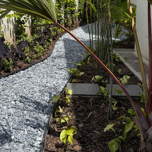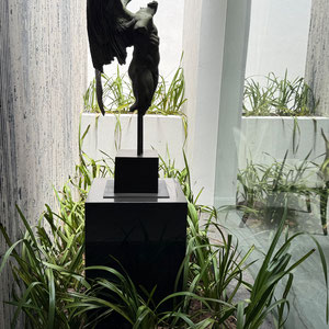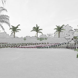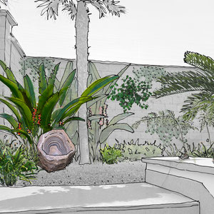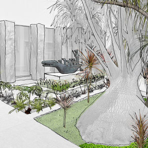 En palmeras preexistentes incrustamos philodendros gigantes; bajo ellas inicia un pequeño andador que lleva a un pasillo selvático de grava negra.Rodeado con vegetación exótica para generar un ambiente onírico, adecuado a la escultura que lucirá.