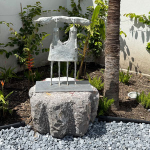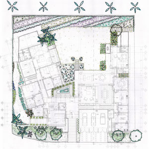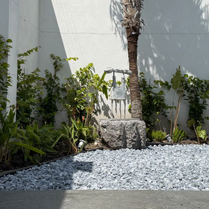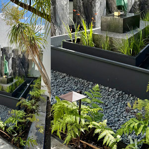 Remodelación próxima a un río, que permite integrar plantas que requieran humedad ambiental. El recibidor y circulaciones, son alrededor de un espejo de agua con helechos, piedra bola negra, y al interior una escultura rodeada por lirios de agua.