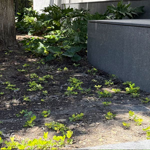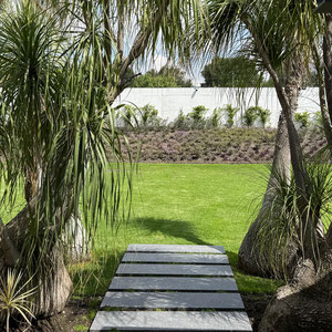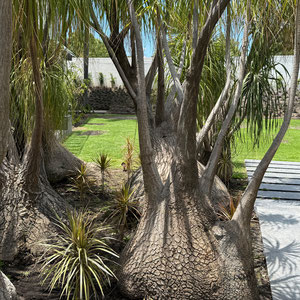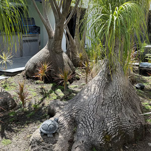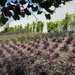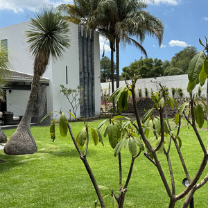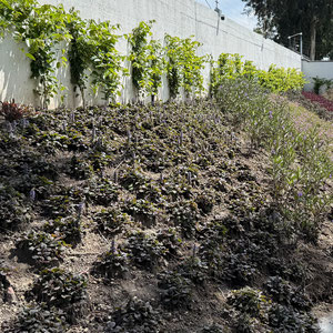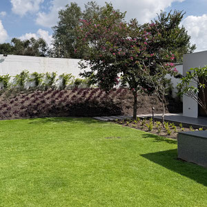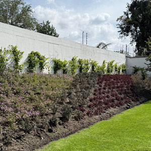 A continuación, se cruza un bosquete de 8 patas de elefante transplantadas; sobre un tapete verde, donde los vacíos son acentuados por dracenas coloradas. Al abrirse el jardín principal, te rodean flores de mayo amarillas, que en su base son acompañadas por helechos macho. Y como remate visual principal, un talud con tiras diagonales de arbustos y cubresuelos morados generan una composición que refuerza la remodelación arquitectónica y su orientación.