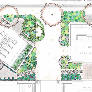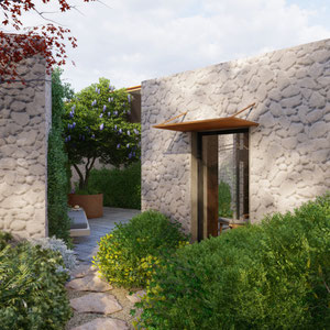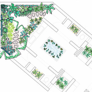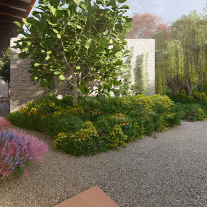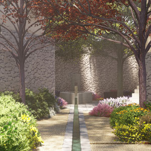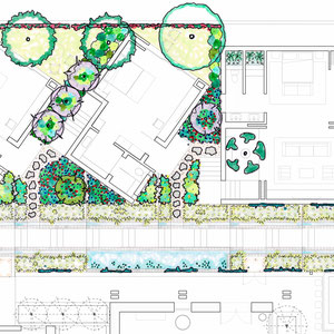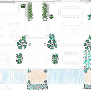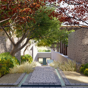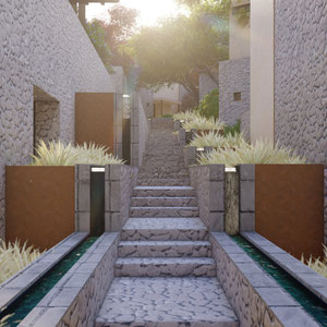 Los espacios residuales de transición son los más floridos e interesantes. Más protagoniza la escalinata, que baja acompañada por dos canales entre un mar de penisetos, juntos caen a cascada cada desnivel; generando un ambiente especial.